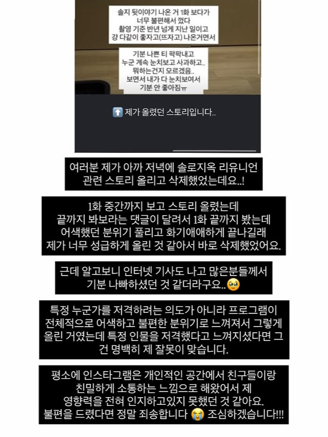 찰스엔터는 15일 SNS를 통해 전날 게시 후 삭제한 ‘솔로지옥 리유니언’ 관련 후기에 관해 입장을 공개했다.