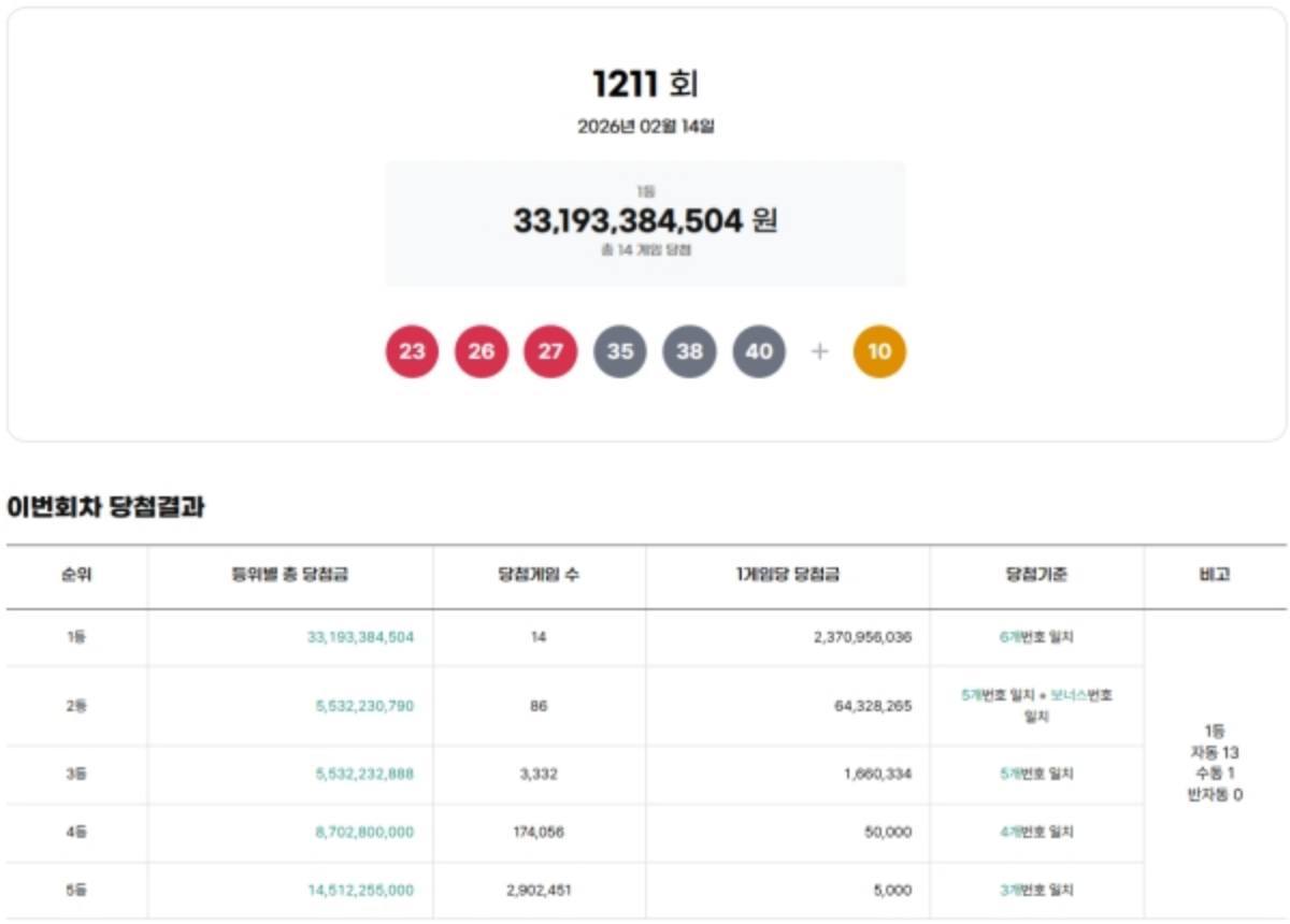 제1211회 로또복권 당첨번호는 23 26 27 35 38 40으로 결정됐다. 2등 보너스 번호는 10이다. 14일 동행복권이 진행한 추첨 결과에 따르면 당첨번호 6개를 모두 맞힌 1등 당첨자는 총 14명이다. 이들은 각각 23억 7095만원의 당첨금을 받게 된다.