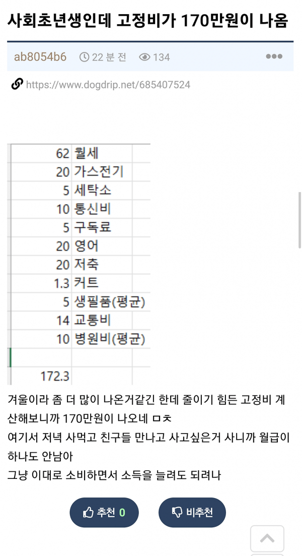 통신비 = 인터넷 포함 가스 전기세 20만원 = 방 2개 옥탑 투룸 겨울에 많이 나옴 영어 = 필요하니까 하는 것 줄이기 불가 세탁소 = 신발,수선,드라이 클리닝 병원비 = 줄이기 불가 월세 62 = 회사가 강남이라 불가 알뜰폰 불가 = 약정 남아서 못함 구독료 = AI,쿠팡,유튜 프리미엄,넷플 뭐든지 잘 먹는 한국인들임대아파트의 현실단무지 빼고 김치랑 밥빼고 양상추 넣어주세요손님들에게 할머니라 했다고 사장에게 잔소리 들은 알바쳇지피티가 알려주는 금연해야 하는 이유