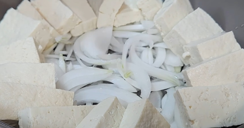 두부는 2cm 정도 두께로 큼직하게 썬다. 너무 작게 자르면 끓이는 과정에서 부서지기 쉽다. 썬 두부는 키친타월 위에 잠시 올려 물기를 빼준다. 그래야 양념이 겉돌지 않고, 국물이 탁해지는 것을 막을 수 있다. 양파는 굵게 채 썰고, 감자는 0.5cm 두께로 납작하게 썬다. 대파와 고추는 어슷하게 썬다.