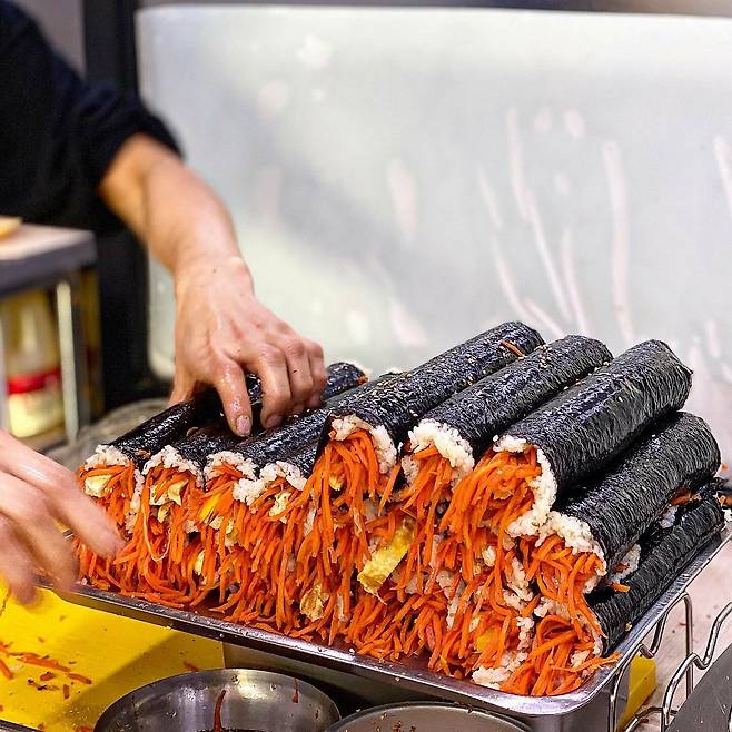 충무김밥의 뒤를 이은 오징어볶음과의 콜라보레이션을 선보이는 곳. 양계장에서 직접 공수 받는 계란, 산지에서 직접 공수하는 더덕 등 고급 식자재를 사용하며, 이에 대한 자부심도 매장 곳곳 엿보인다. 십여 가지의 김밥과 오징어 요리, 분식 류를 함께 판매하고 있는 것이 특징인데 오징어볶음을 김밥과 함께 먹는 것을 추천한다고. 속 재료가 큼직큼직하게 들어있어 씹는 맛이 있으면서 채소의 즙이 입안에서 기분 좋게 어우러진다.