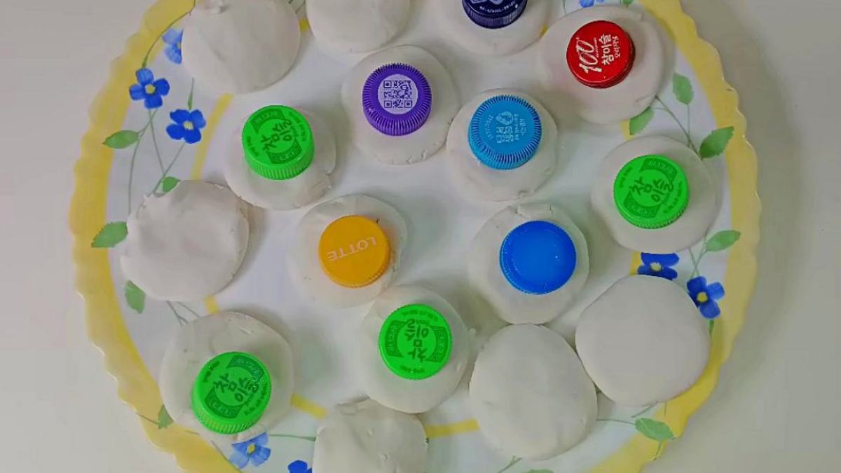 쌀가루 반죽 위에 병뚜껑을 1개씩 올려보자?!