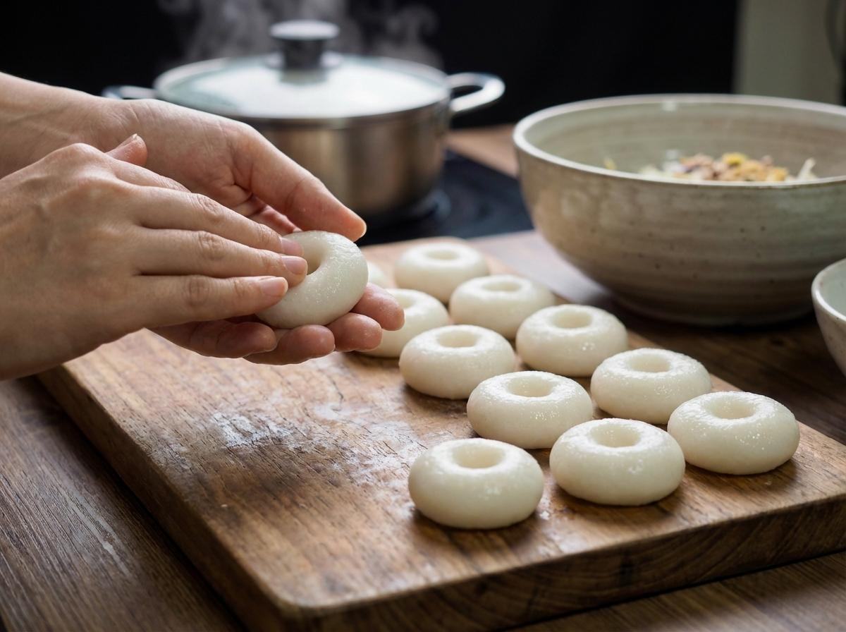 구멍떡 방식에서는 멥쌀가루에 물을 넣어 반죽한 뒤 100원 동전 크기로 떼어 가운데에 구멍을 낸다. 이때 손으로 모양을 만들기 어렵다면 병뚜껑을 반죽 위에 눌러 사용하는 방법이 효과적이다. 힘을 균일하게 줄 수 있어 모양이 일정해지고 작업 속도도 빨라진다. 이 작은 도구 하나로 완성도가 눈에 띄게 달라진다. 구멍떡처럼 가운데 구멍을 내면 뜨거운 물이 통과하면서 안팎으로 열이 동시에 전달된다. 따라서 덕분에 아주 짧은 시간에 속까지 설익은 곳 없이 균일하게 익힐 수 있게 된다.