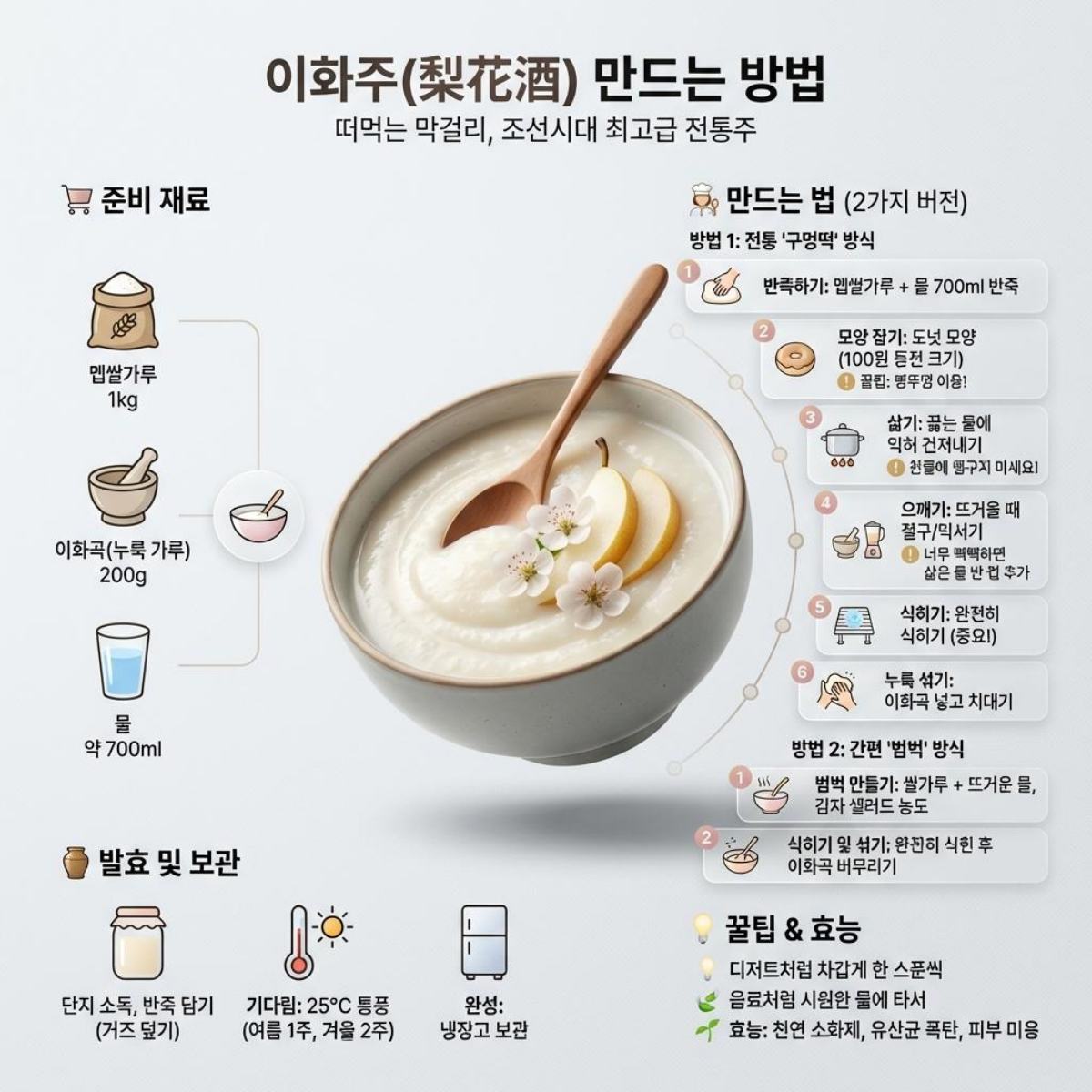명절 상에 술 한 잔을 올릴 때, 흔한 막걸리 대신 조금 다른 선택을 찾는 집이 늘고 있다. 조선시대 양반가에서 귀한 손님에게 내놓던 전통주 '이화주'가 다시 주목받는 이유다. 배꽃이 필 무렵 담근다고 해 이름 붙은 이 술은 물 사용을 최소화해 요거트처럼 걸쭉하게 떠먹는 형태가 특징이다. 술이라기보다 발효 음식에 가깝다는 평가를 받는다.