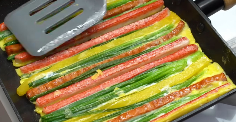 재료는 비교적 간단하다. 맛살, 김밥용 햄, 단무지, 쪽파 한 줌, 감자전분, 물, 계란만 있으면 된다. 먼저 맛살과 햄, 단무지는 길이를 맞춰 길쭉하게 썬다. 꼬지전은 길이가 중요하다. 너무 짧으면 전을 부칠 때 흐트러지고, 너무 길면 팬에서 뒤집기 어렵다. 비슷한 길이로 맞추는 것이 완성도를 높인다.