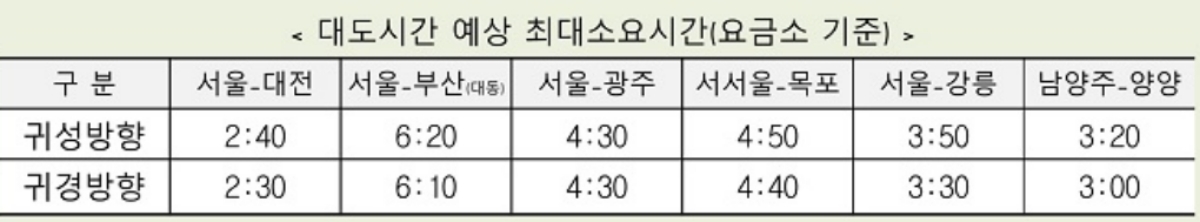 이날 오전 8시 기준 서울 요금소에서 전국 주요 도시까지 예상 소요 시간은 부산 6시간 20분, 울산 6시간, 목포 4시간 40분, 대구 5시간 20분, 광주 4시간 20분, 강릉 3시간 10분, 대전 2시간 20분이다.