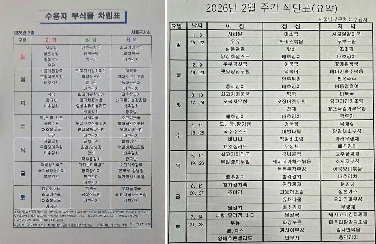 서울구치소는 설날 당일인 17일 아침으로 떡국, 김자반, 배추김치를 제공한다. 점심은 소고기된장찌개, 감자채햄볶음, 양상추유자샐러드, 배추김치다. 저녁은 고추장찌개, 돼지통마늘조림, 배추김치, 잡곡밥으로 구성됐다. 서울남부구치소는 같은 날 아침에 소고기매운국, 오복지무침, 배추김치를 제공한다. 점심은 떡국, 오징어젓무침, 잡채, 배추김치다. 저녁은 미역국, 닭고기김치조림, 청포묵김가루무침, 깍두기다.구치소의 1인당 1일 급양비는 5201원으로 규정돼 있다. 이를 단순 환산하면 1끼당 평균 1580원 수준이다. 식사 재료비 기준이다. 식단은 영양 기준에 맞춰 편성되며, 특정 수용자에게 별도 제공되는 메뉴는 없다.