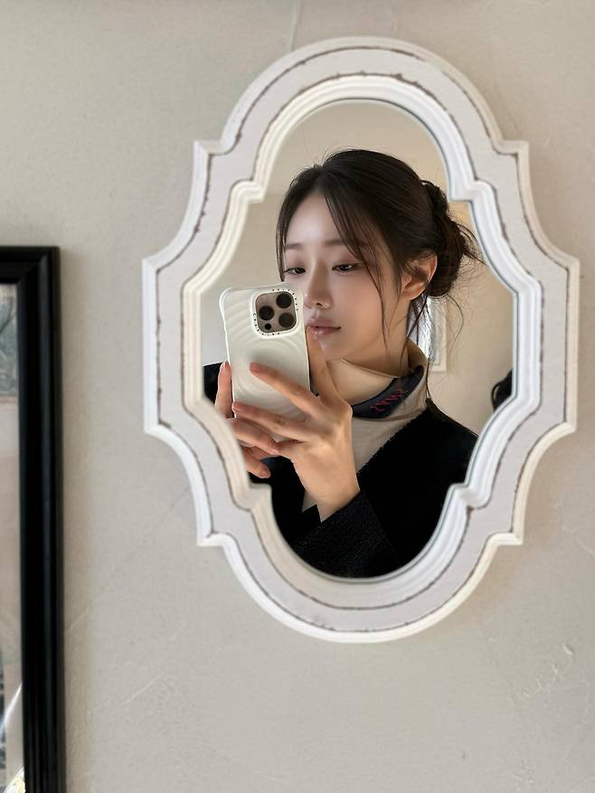 자칫 평범할 수 있는 조합이지만 이시안만의 맑은 이미지와 만나 한층 지적인 분위기를 완성하고 있어요.