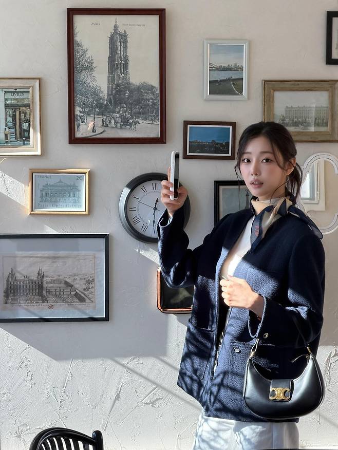 "커피 한 잔도 화보가 되네요" 이시안이 보여준 고급스러운 트위드 재킷룩