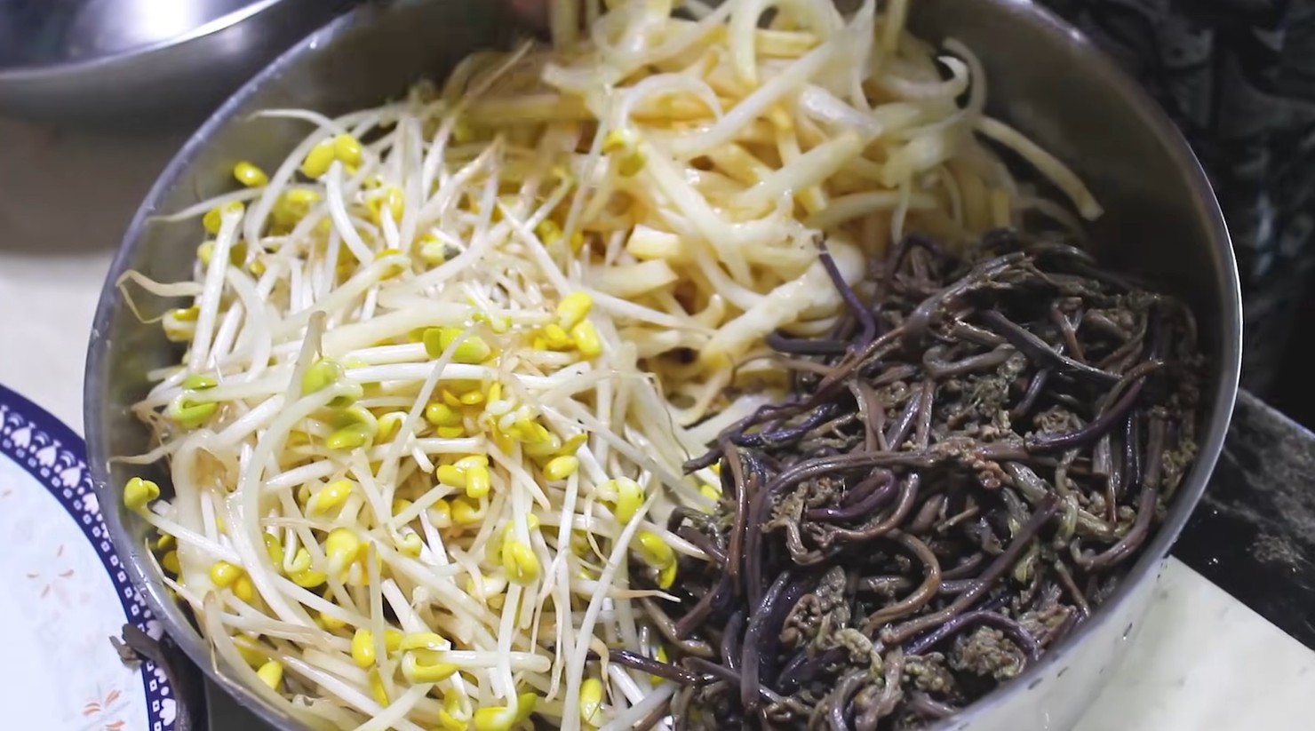 먼저 도라지는 가늘게 찢어 소금물에 바락바락 주물러 쓴맛을 제거한다. 이후 흐르는 물에 여러 번 헹군 뒤 물기를 빼고, 끓는 물에 소금을 약간 넣어 2분 정도 데친다. 너무 오래 삶으면 질겨질 수 있으니 시간을 지키는 것이 좋다. 고사리는 미리 불려 삶아 둔 것을 사용한다. 질긴 줄기 부분은 제거하고 먹기 좋은 길이로 자른다. 콩나물은 뿌리를 정리한 뒤 깨끗이 씻어 체에 밭쳐 둔다.