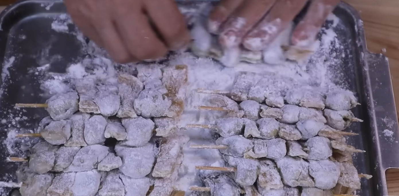 2. 밀가루를 얇게 묻힌다. 굴 표면에만 살짝 묻히는 정도면 충분하다.