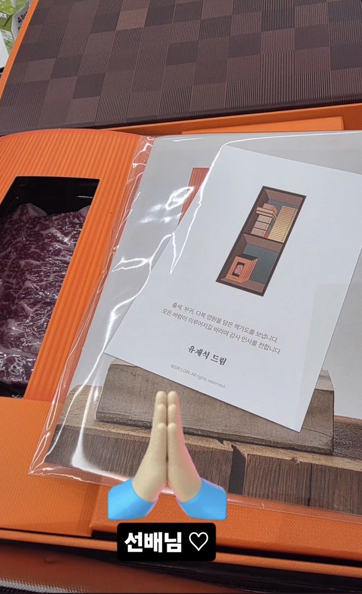 16일 홍현희는 자신의 SNS에 '선배님'이라는 문구와 하트 이모티콘이 적힌 사진을 올렸다. 이 게시물에는 유재석이 준비한 것으로 보이는 소고기 세트와 책가도 이미지가 담긴 메시지 카드가 함께 담겼다.