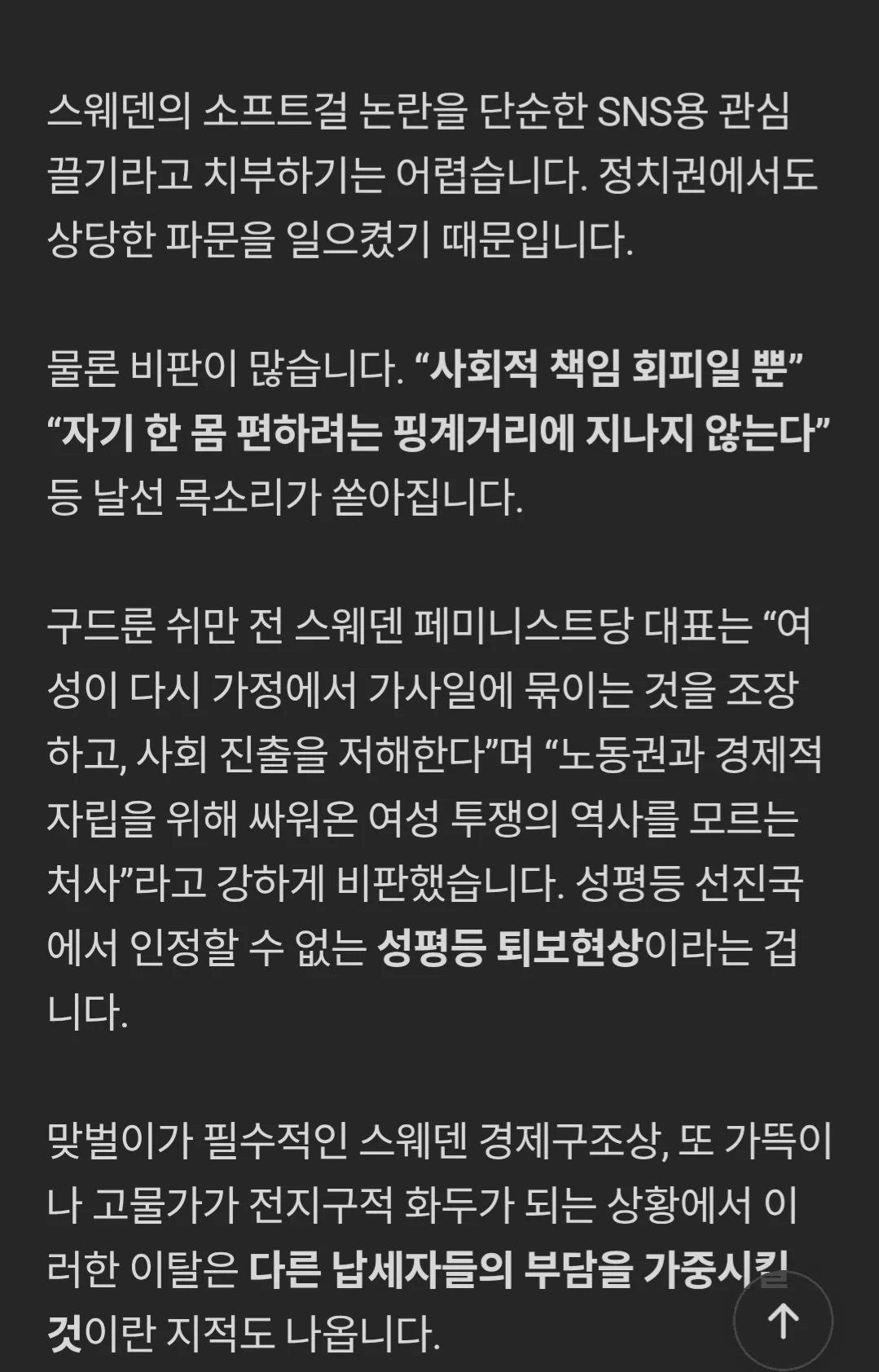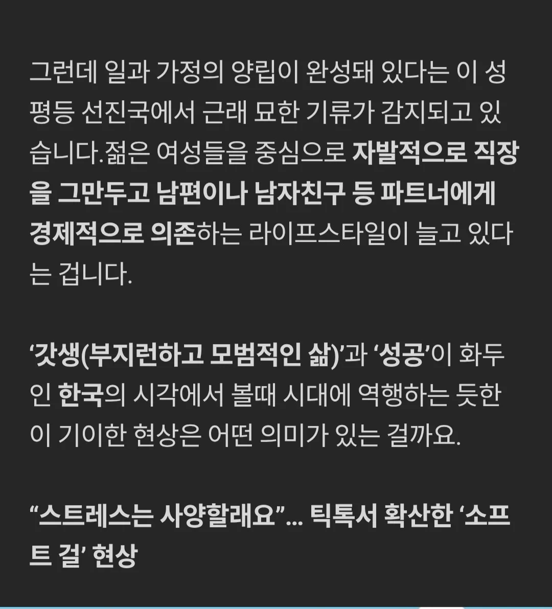 요약 - 성평등 1위 스웨덴에 소프트걸 현상이 유행함. - 일 그만두고 남자 돈으로 힐링하는 여자가 늘어나는중 - 여성들이 일을 그만둘경우 사회보장 시스템 붕괴 우려. - 스웨덴 페미당 대표는 성평등 퇴보현상이라며 강하게 비판. 강인한 바이킹 여전사들도 결국 일에 지쳐 포기하는중. 충주맨 해명에 대한 디시 근황주인님! 속지마세요 그놈은 제가 아니에요!!혼밥러들 공개처형 하는 음식점AI) ChatGPT vs Gemini 근황이와주에 기초수급 갤러리 근황