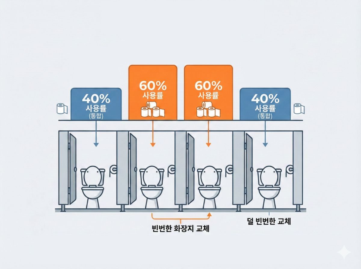 비슷한 맥락의 연구도 있다. 심리학자 니콜라스 크리스텐펠드는 10주 동안 네 개의 화장실 칸에서 휴지가 얼마나 자주 교체되는지를 추적했다. 그 결과 다 쓴 휴지 롤의 60%가 가운데 칸에서 나왔고, 양쪽 끝 칸에서는 40%만 교체됐다. 이는 이용자들이 가운데 칸을 더 선호한다는 것을 보여주는 수치다. 무작위 확률로 예상되는 사용 비율보다 가운데 칸 사용이 많았다는 의미다.