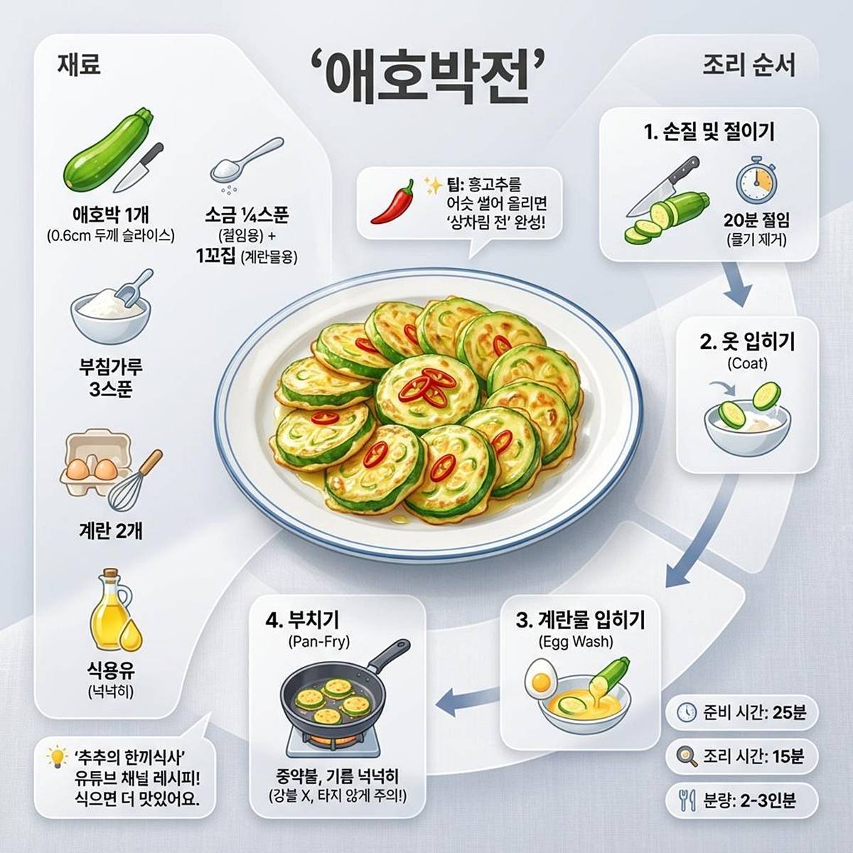 명절을 앞두고 ‘기본 애호박전’ 팁도 함께 알아두면 좋다. 유튜브 채널 '추추의 한끼식사'에 식으면 더 맛있 '애호박전' 레시피가 올라와 눈길을 끌었다.