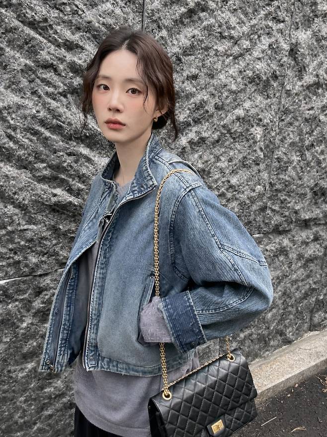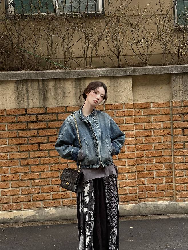빈티지한 워싱이 돋보이는 데님 재킷은 목선까지 올라오는 하이넥 디자인을 선택해서 시크한 느낌을 주며, 재킷 아래로 자연스럽게 흘러나온 이너의 밑단이 전체적인 룩에 자유로운 감성을 더해주고 있네요.