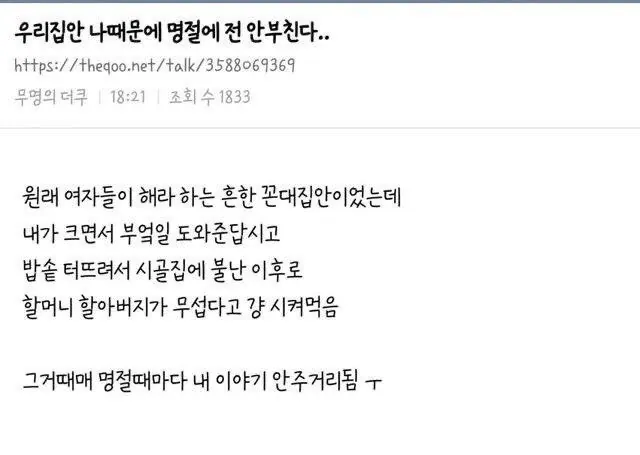 우리 집안 나 때문에 명절에 전 안부친다..