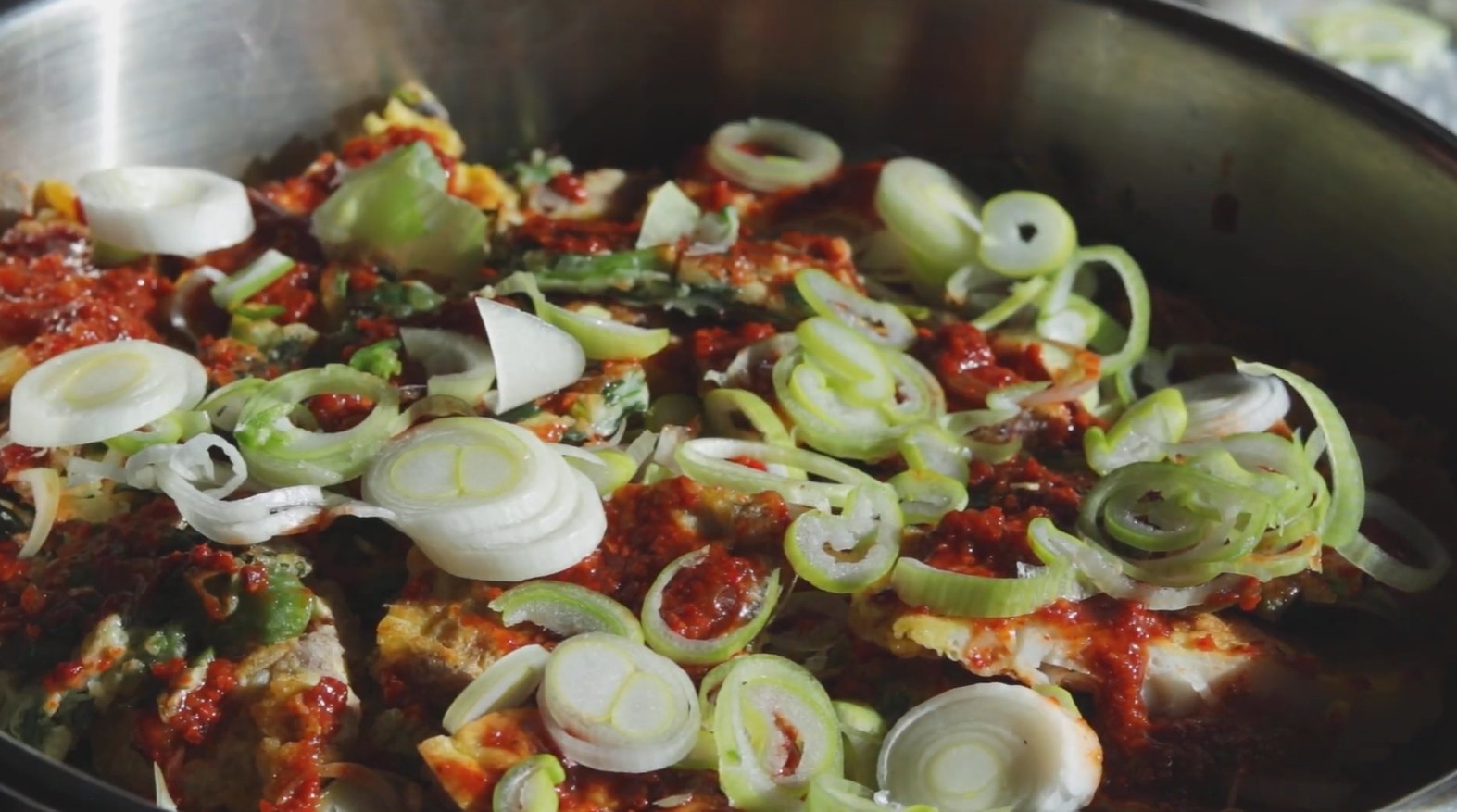 전이 어느 정도 따뜻해지면 팬 가장자리에 양파를 깔고 그 위에 전을 다시 올린다. 준비해 둔 양념장을 고루 붓는다. 처음에는 중불에서 끓이다가 양념이 끓어오르면 약불로 줄인다. 뚜껑을 덮고 3~4분 정도 졸이면 양념이 전 속으로 스며들기 시작한다.