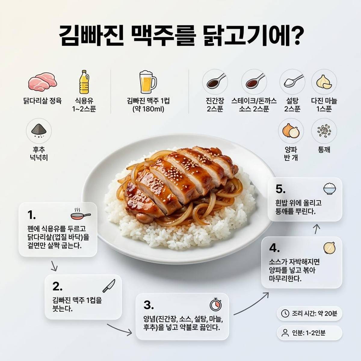 이제 양념은 5가지로 끝낸다. 진간장 2스푼, 스테이크나 돈까스 소스 2스푼, 설탕 2스푼, 다진 마늘 1스푼, 그리고 후추를 넉넉히 뿌린다. 넣은 양념을 골고루 섞어준 뒤, 약불로 은은하게 끓여 맥주가 다 졸아들 때까지 기다린다. 소스가 ‘자박’해지면 양파 반 개를 썰어 넣고, 남은 양념과 함께 한 번 더 볶아 마무리한다. 마지막은 뜨끈한 흰밥 위에 닭고기와 양파를 올리고 통깨를 뿌리는 방식. 밥에 소스를 비벼 한 숟갈 뜨면, 단순한 닭볶음이 아니라 “덮밥용 완성 메뉴”가 된다.