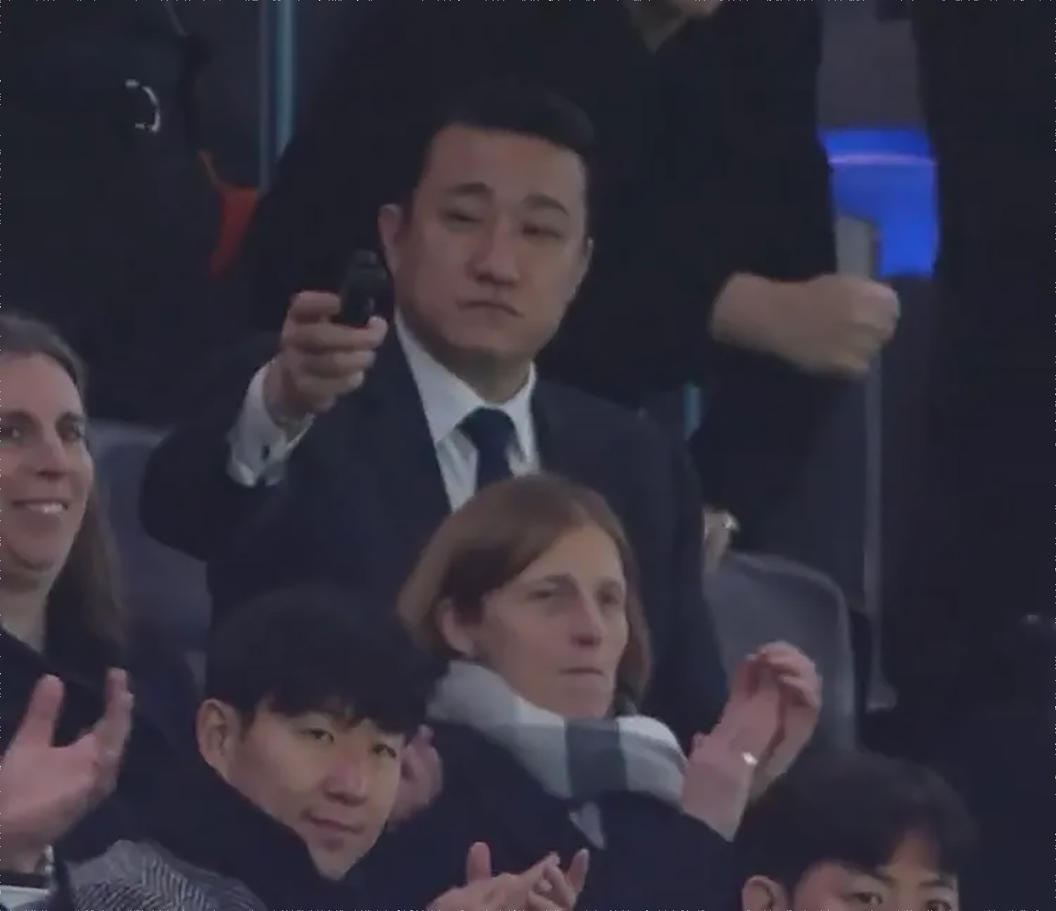 해당 인물은 관중석의 모든 팬이 일어나 열광적인 박수를 보내는 긴박한 상황 속에서도 오직 손흥민에게만 시선을 고정한 채, 흔들림 없는 눈빛과 침착한 태도를 유지해 눈길을 끌었다. 특히 날카로운 눈빛과 굳게 다문 입술, 그리고 깔끔한 정장 차림이 묘한 위압감을 풍겼다.