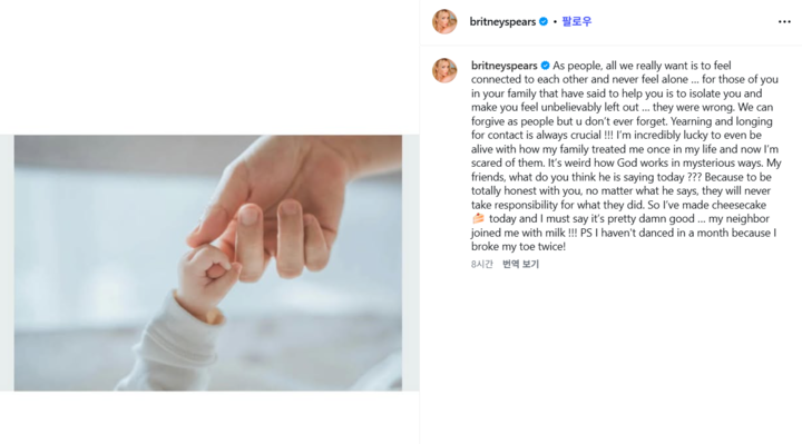 브리트니 스피어스는 2월 18일 자신의 개인 계정을 통해 “사람들은 서로 연결돼 있다는 느낌을 원하고, 결코 혼자라고 느끼고 싶지 않다”고 말하며, 오랜 세월 가족들로부터 받은 대우에 대해 속마음을 밝혔다.