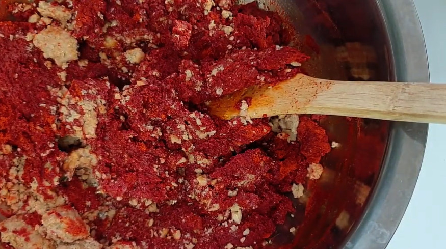 볼에 고추장을 먼저 넣고 고춧가루를 섞어 색을 낸다. 여기에 다진 마늘, 간장, 매실청, 식초를 넣고 골고루 저어준다. 마지막에 간 배를 넣고 잘 섞는다. 배는 한 번에 다 넣지 말고 조금씩 넣어 농도를 맞춘다. 너무 묽어지면 보관 기간이 짧아질 수 있다. 원하는 농도보다 약간 되직하게 맞추는 것이 좋다.