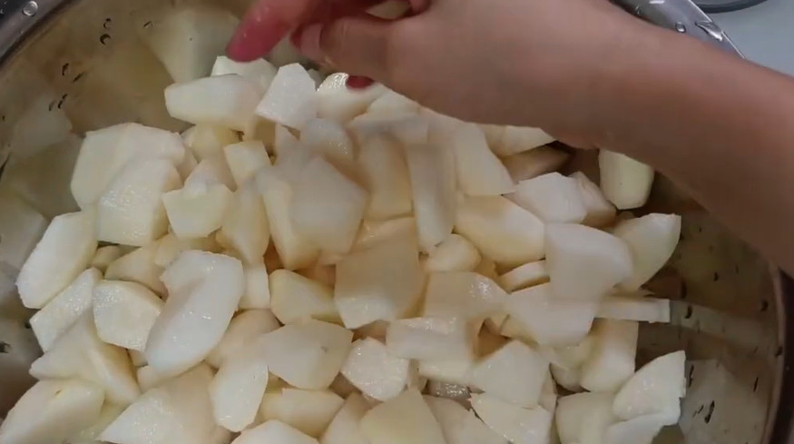 먼저 배 손질이 중요하다. 껍질을 벗기고 씨와 심지를 제거한다. 무른 부분이 있다면 과감히 도려낸다. 깨끗이 씻은 뒤 강판에 갈거나 믹서에 곱게 간다. 이때 물을 따로 넣지 않는다. 배 자체 수분으로 충분하다. 갈아 놓은 배는 체에 한 번 걸러 과육과 즙을 분리하면 식감이 더 부드럽다. 걸러낸 과육은 버리지 말고 함께 사용해도 좋다.