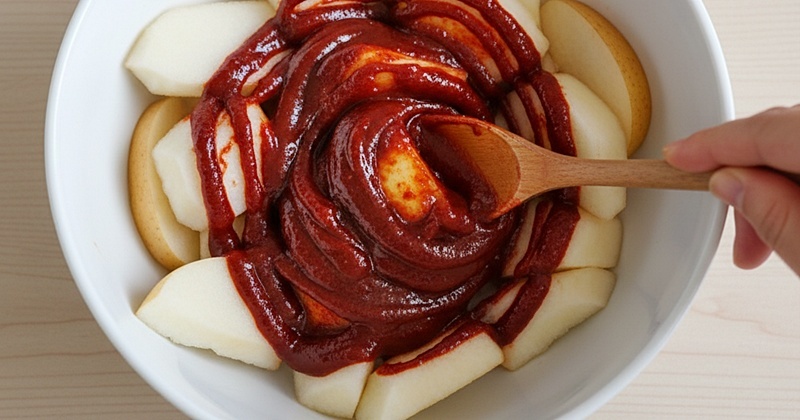 준비 재료는 간단하다. 배 1개(중간 크기), 고추장 1컵, 고춧가루 1큰술, 다진 마늘 1큰술, 간장 1큰술, 매실청 또는 올리고당 1큰술, 식초 1큰술, 참기름 1작은술을 준비한다. 매콤함을 더하고 싶으면 청양고추를 소량 다져 넣어도 된다.