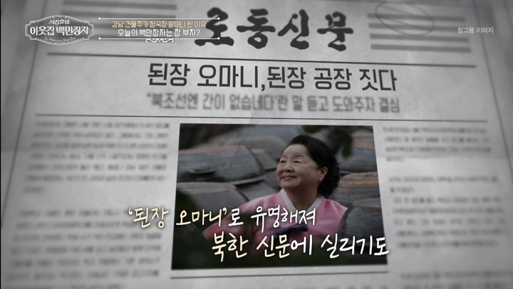 이 노력 끝에 북한에 된장 공장이 완공됐고, 현지 매체에서 ‘된장 오마니’라는 별칭까지 얻으며 널리 이름을 알렸다.