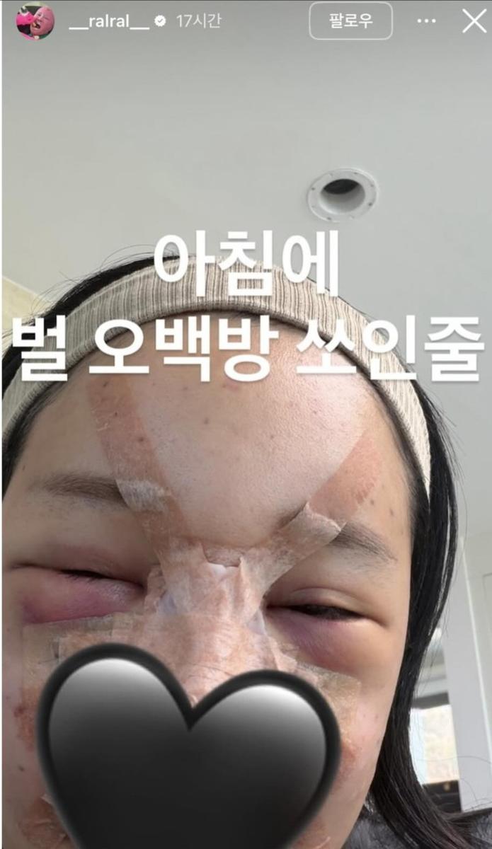 코와 눈 주위에 붕대가 감긴 사진과 함께, 랄랄 특유의 유쾌한 말투로 자신의 근황을 전했다. “아침에 벌 오백 방 쏘인 줄”이라는 코멘트를 더해 웃음을 안겼다. 이어 수술 후 한 달간 금주를 해야 한다는 사실을 공개해 아쉬움을 드러내기도 했다.