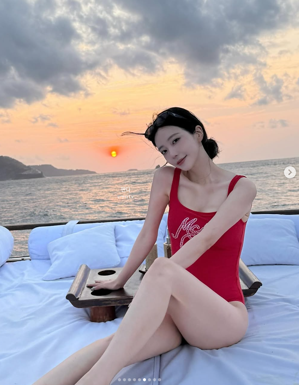 강렬한 레드 톤이 돋보이는 '데이즈데이즈'의 스트링 비키니를 선택해 잘록한 허리 라인을 더욱 강조하셨더라고요.