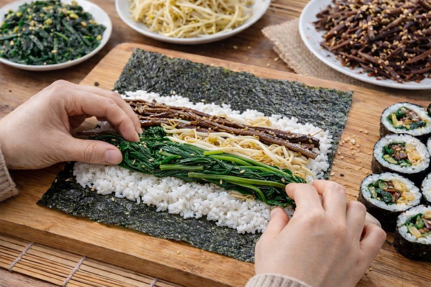 속재료를 올리기 전에는 나물의 수분을 정리해야 한다. 보관 과정에서 생긴 물기를 그대로 두면 김이 눅눅해지고 김밥이 쉽게 풀어진다. 나물을 손으로 가볍게 쥐어 여분의 수분을 제거한 뒤 길게 올려야 단단하게 말린다. 여러 종류를 함께 넣으면 단면의 색감과 식감이 동시에 살아난다. 계란지단이나 단무지 등을 추가해 구성을 넓힐 수도 있지만, 나물만으로도 한 끼 식사로 부족함이 없다.