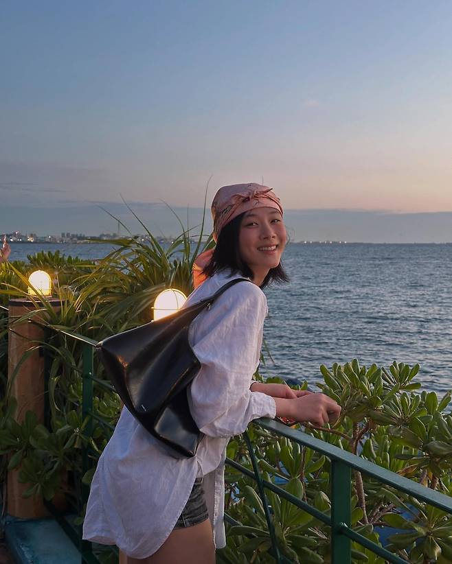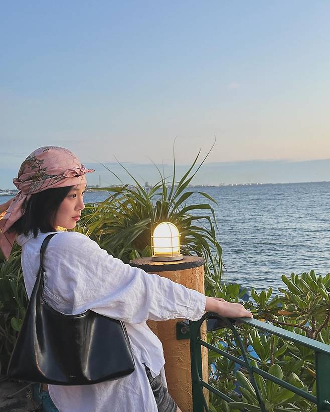 비비가 보여준 이번 스타일은 탁 트인 바다를 배경으로 자유롭고 몽환적인 분위기를 자아내는 내추럴 시크룩이에요.