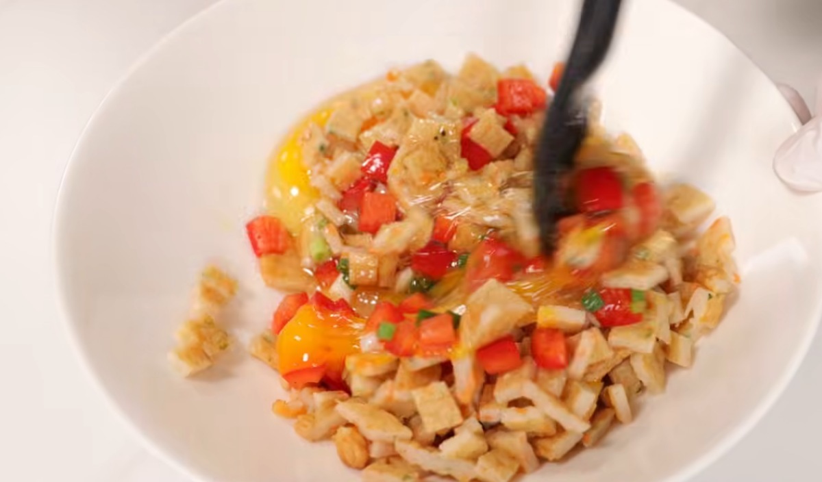 유튜브 '맛난메뉴'에 따르면, 먼저 파프리카 1/4개와 쪽파를 작게 다져준다. 다음으로 어묵 2장을 작게 깍둑썬다. 이후 잘게 다진 재료들을 그릇에 담은 후 그 위에 계란 2개를 깨뜨려 넣어준다. 이후 진간장 1작은술, 소금, 후추를 넣어 간을 맞춘다.