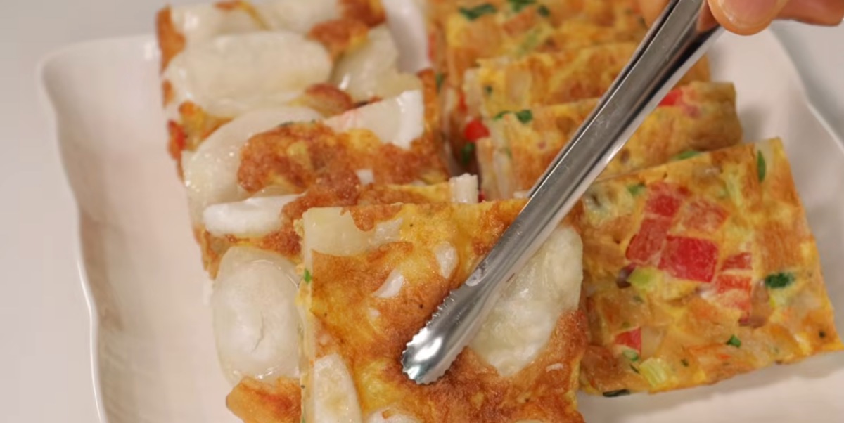 물에 불려둔 떡국떡 190g의 물기를 제거한 후 기름을 두르지 않은 팬에 절반만 넣어 펼쳐준다. 이 위에 앞서 만들었던 반죽을 절반 정도만 부어 고르게 펴준 후 노릇노릇하게 구워주면 완성이다. 바삭하고 아삭하면서도 쫄깃한 식감이 제맛인 간단한 떡국 전이 만들어진다.