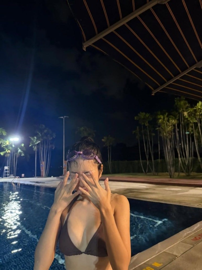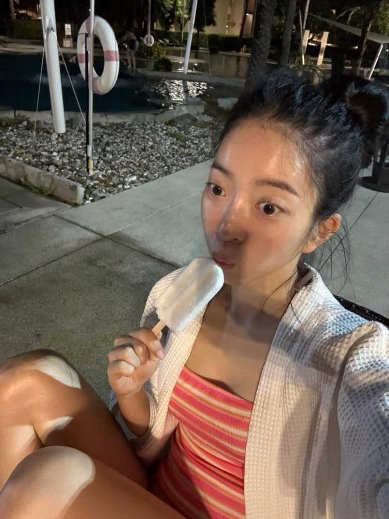 밤 수영장에서 아이스크림을 먹는 사진을 보면, 조명 아래서 매끈하게 빛나는 투명한 피부가 정말 인상적이죠.