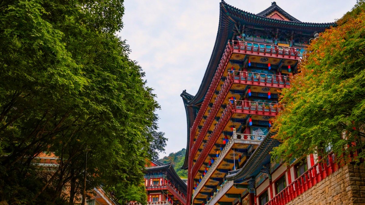 전통적인 목조 건축물이 아닌 현대식 콘크리트 구조와 화려한 단청이 결합된 고층 건물들이 특징이다. 또 골짜기의 지형을 따라 5층 이상의 거대한 전각들이 빽빽하게 들어서 있어 이국적인 풍경을 자랑한다.