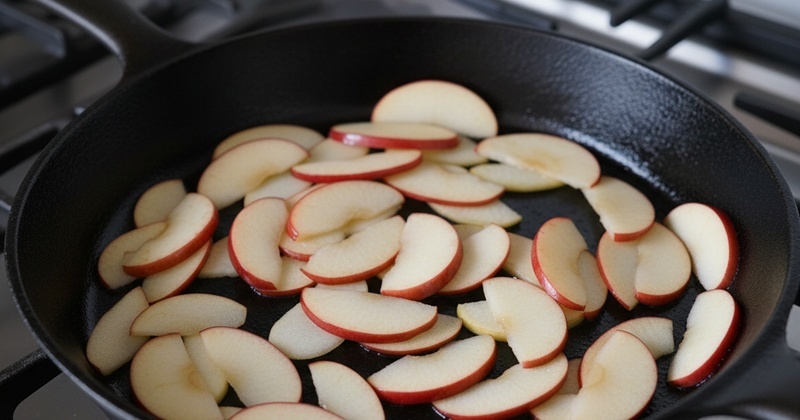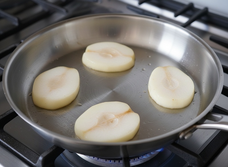 팬에 굽는 방법이 가장 간단하다. 중약불로 예열한 팬에 버터를 소량 녹인다. 버터 대신 올리브유를 써도 된다. 과일을 올리고 한 면당 3~4분씩 천천히 굽는다. 설탕을 뿌리지 않아도 자연스러운 캐러멜화가 일어난다. 표면이 노릇해지면 뒤집는다. 이때 자주 뒤집지 말고 한 번에 익혀야 색이 고르게 난다.