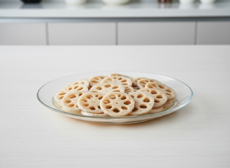 아삭한 식감을 살리는 첫 번째 비법은 ‘짧고 강하게’ 데치는 것이다. 끓는 물에 소금 약간과 식초 1큰술을 넣은 뒤 연근을 넣고 1분 30초에서 2분 이내로만 데친다. 식초는 조직을 조여주는 역할을 해 물러짐을 방지한다. 오래 데치면 전분이 풀어져 식감이 퍼지기 때문에 시간을 반드시 지켜야 한다.