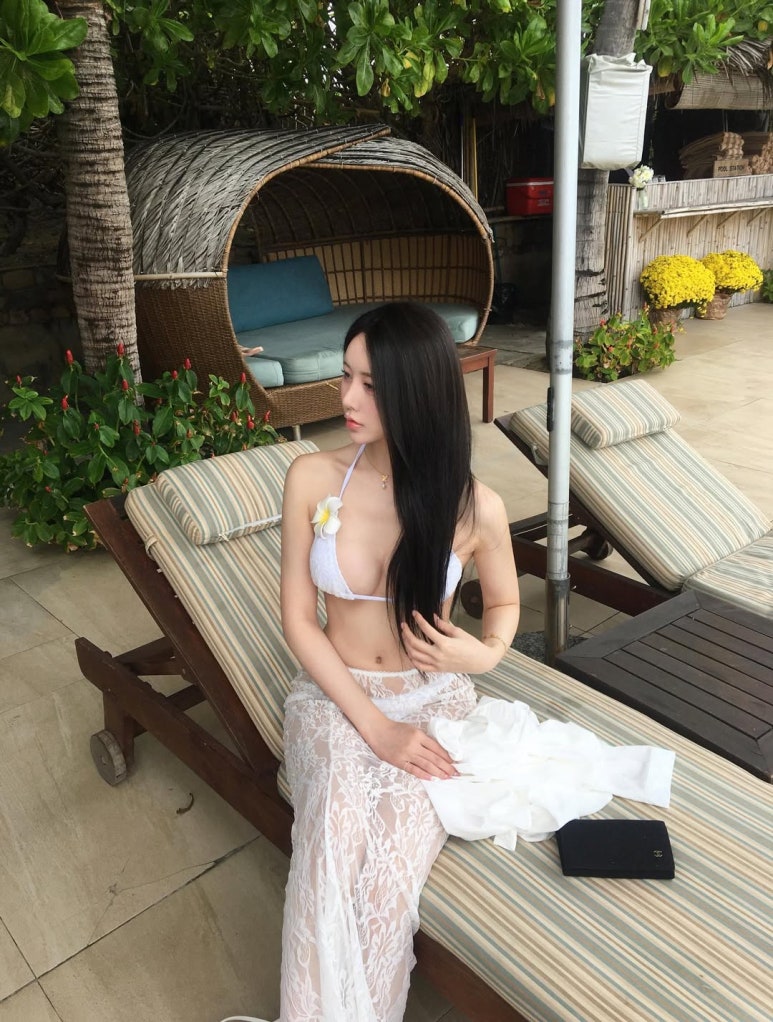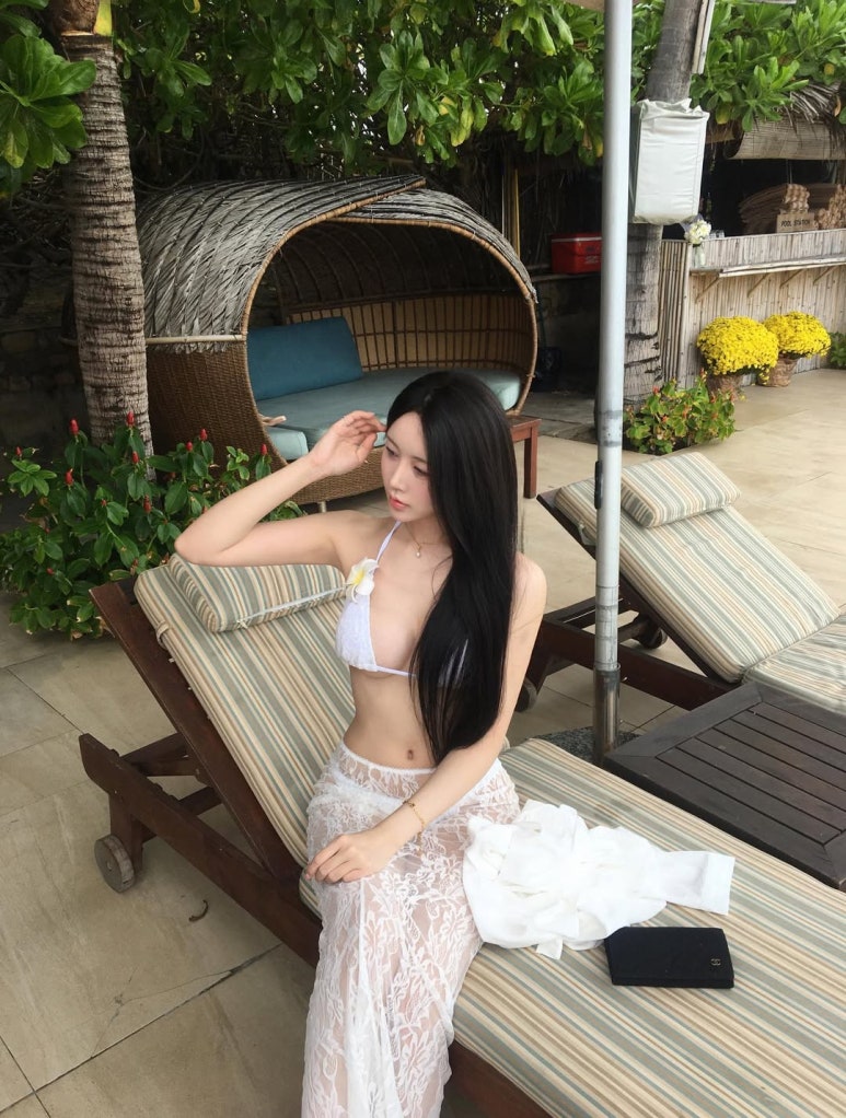 화이트 삼각 비키니, 노란 꽃 포인트, 시스루 레이스 스커트, 글로우 메이크업, 그리고 흑발 생머리까지.