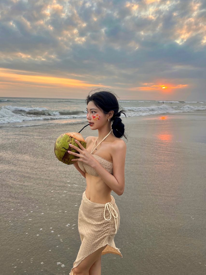 밝은 하늘색 비키니와 햇살이 만든 청량한 건강미가 돋보여요.