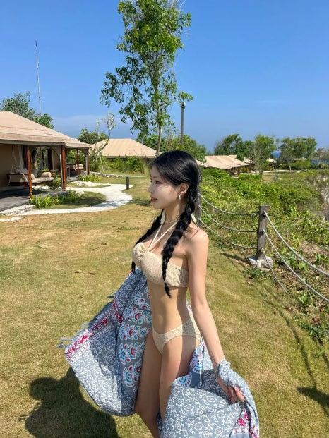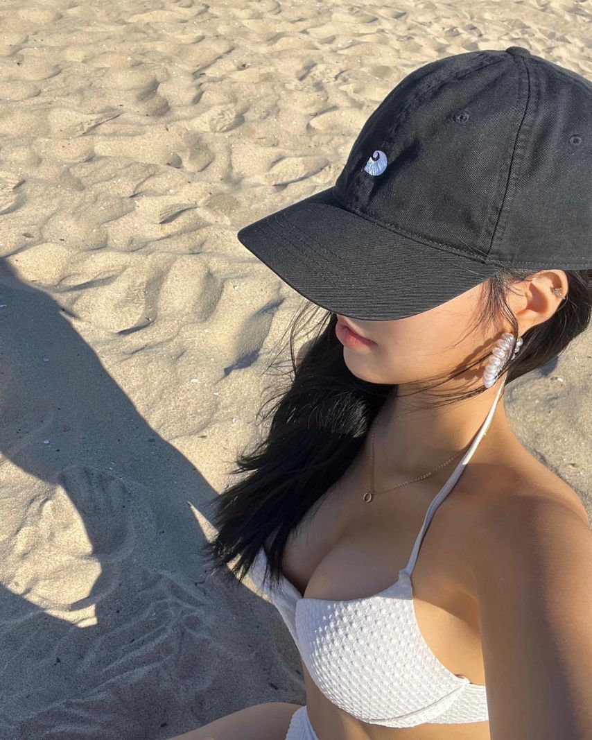 하늘색 비키니의 청량함과 화이트 톱의 고혹미가 극명한 대비를 이뤄요.