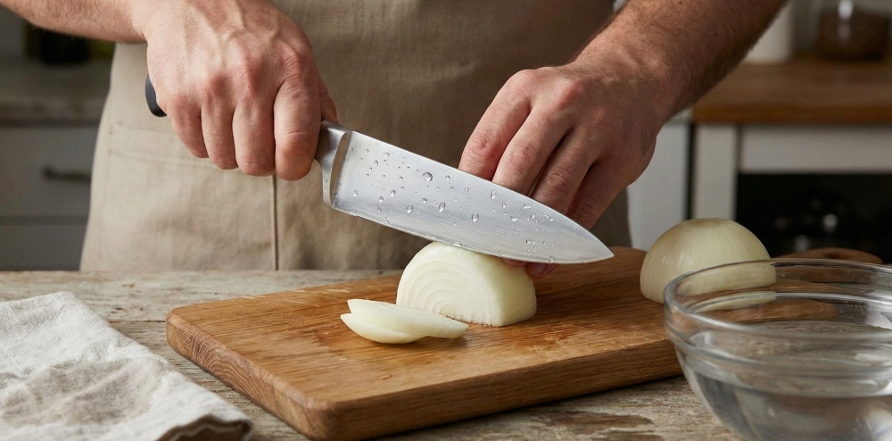 이 밖에 다른 방법도 있다. 바로 '칼에 물을 묻혀 사용하는 것'이다. 물이 묻은 칼로 양파를 자르면 생성된 화학물질이 공기 중으로 퍼지기 전에 물에 일부 용해된다.