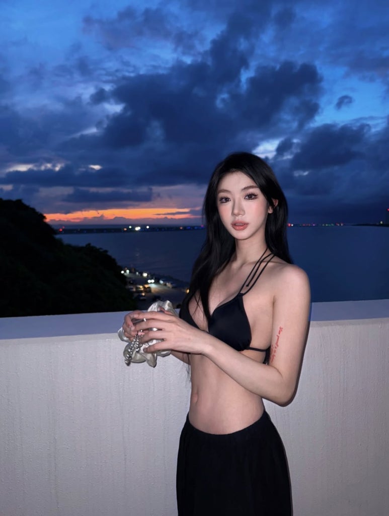 블랙 홀터넥 비키니, 와이드 팬츠 레이어드, 그리고 블루 아워 배경까지 모든 요소가 조화를 이루며 시크한 무드를 완성했죠.
