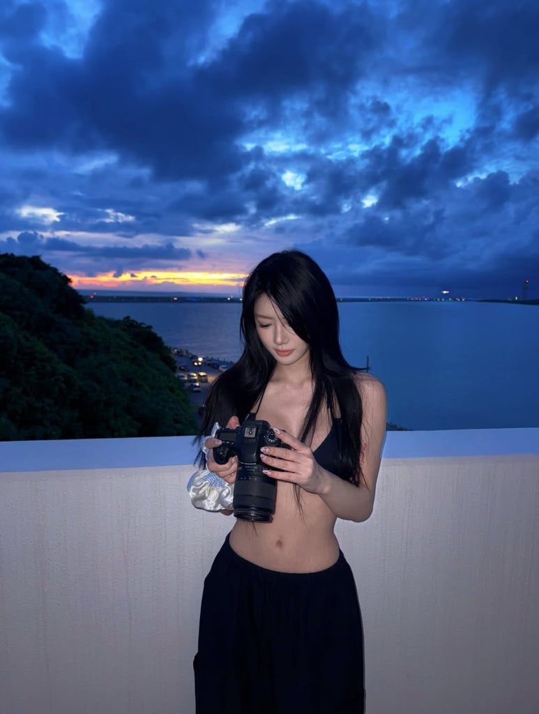 블랙 비키니 + 와이드 팬츠 + 실버 포인트 + 블루 아워 + 카메라 소품 = 시크 나이트 완성이에요.