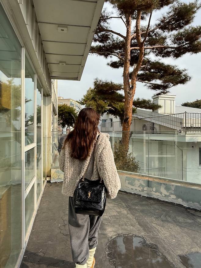 부드러운 질감이 살아있는 연한 회색 털 외투를 메인으로 선택해서 시각적으로 매우 따뜻하고 안락한 인상을 줍니다.