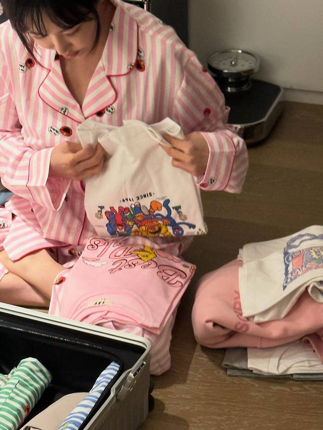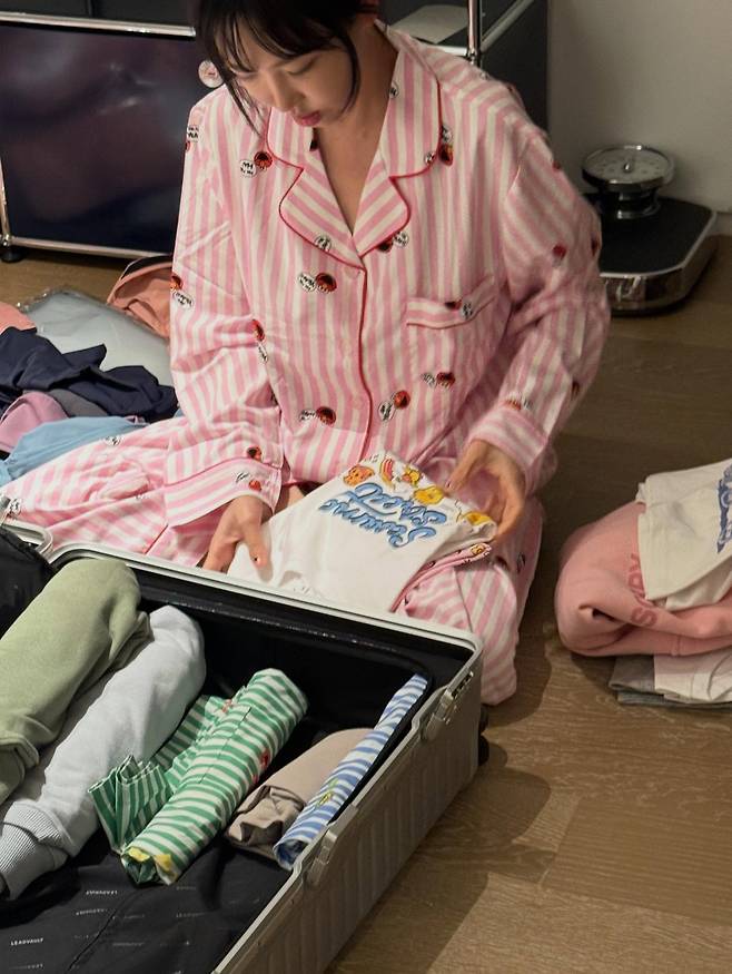 강예원이 보여준 이번 모습은 여행을 앞두고 짐을 꾸리는 설레는 일상 속에서 본인만의 사랑스럽고 발랄한 매력을 잘 드러낸 편안한 잠옷 차림이에요.