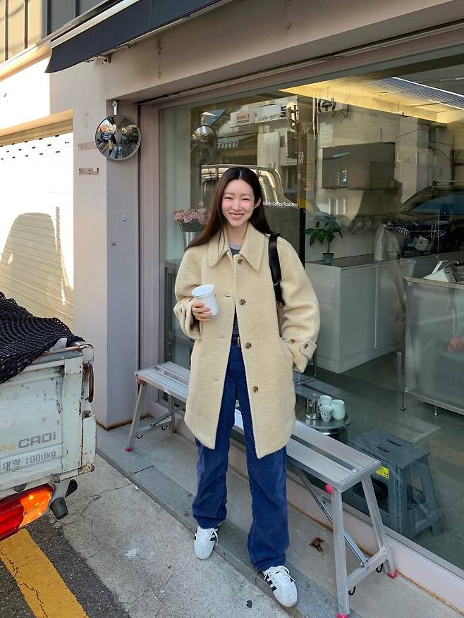 따뜻한 질감이 느껴지는 아이보리색 반코트를 메인 아이템으로 선택해서 시각적으로 매우 부드럽고 화사한 인상을 줍니다.