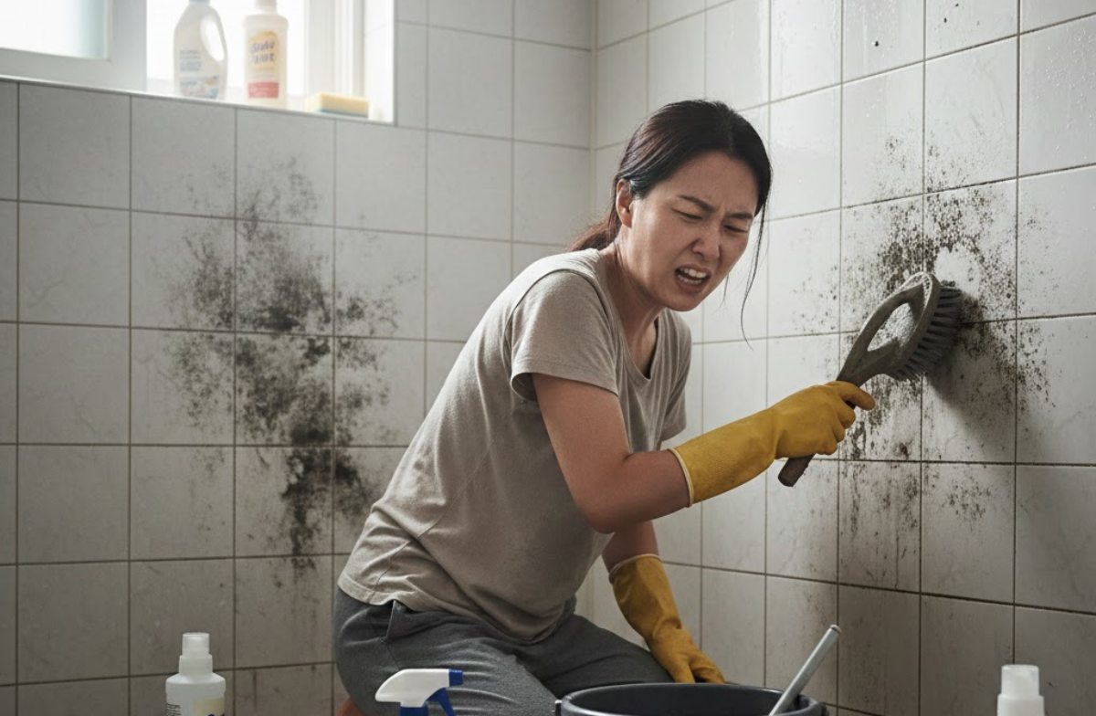 욕실의 찌든 때는 비누 성분, 각질, 피지 등이 섞여 표면에 쌓이면서 생긴다. 여기에 습도가 높고 환기가 부족하면 곰팡이가 증식하기 쉬운 환경이 된다. 곰팡이는 공기 중에 떠다니는 포자가 습한 표면에 자리 잡아 자라며, 실리콘 틈이나 타일 줄눈처럼 수분이 오래 머무는 곳에서 빠르게 번진다.