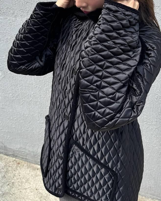 다이아몬드 형태의 촘촘한 퀼팅 무늬가 돋보이는 검은색 점퍼를 메인 아이템으로 선택해서 시각적인 안정감과 동시에 도시적인 세련미를 자아내고 있네요.